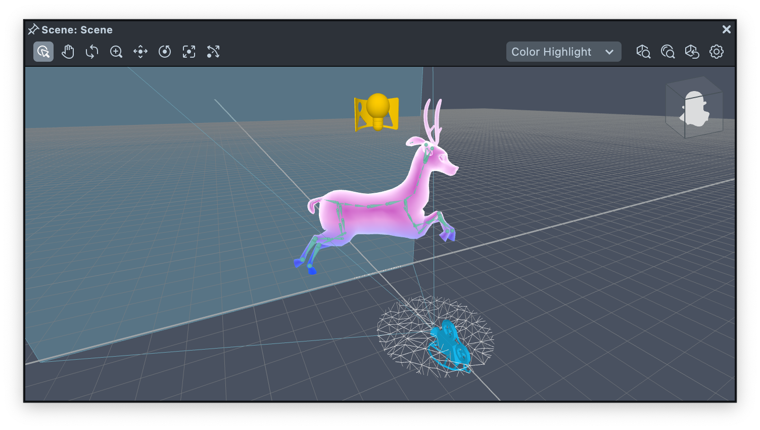 The Scene panel is where you can interact with the 3D objects in your scene. In the Scene panel, you'll be able to visually move, rotate and scale objects. The Scene panel's toolbar gives you access to various controls for the camera.