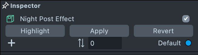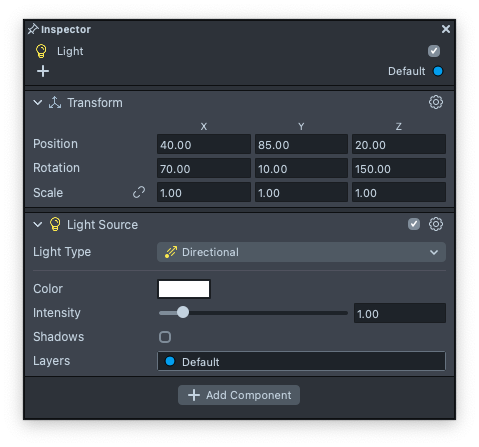 The Inspector panel allows you to add and edit components on the selected object. Components are the building blocks of objects. They define what an object does and how an object is visualized. In addition to adding components, the Inspector panel allows you to edit parameters of existing components. Note, all objects are required to have a Transform component. The Transform component gives you the ability to tune the object's Position, Rotation and Scale.