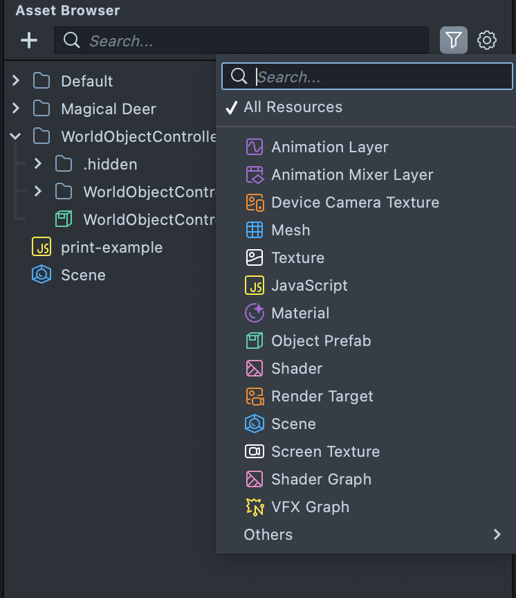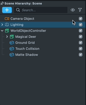Additionally, with the Add New Object button, you're able to add objects that come with preset components including the Camera, Light, Image, Liquify, Mesh Visuals, Screen Image and Post Effect objects.