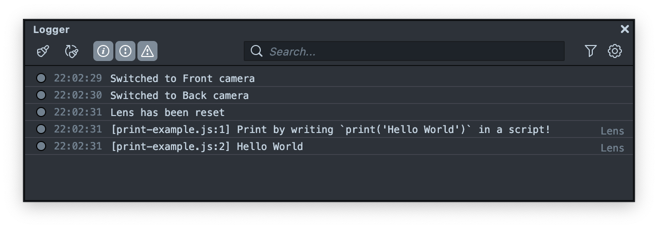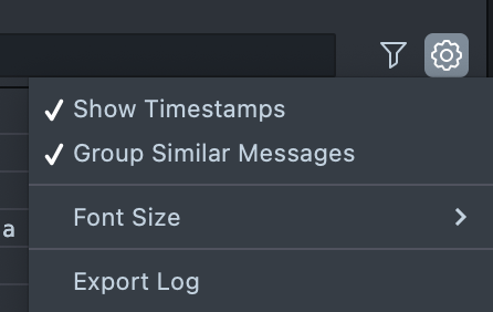 The Settings button provides additional options for modifying what is visible in your logs, such as whether time is shown or logs with the same messages are grouped. Additionally, you can change the size of the messages printed, or export the logs as a text file.