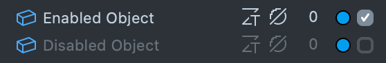 Objects can be enabled and disabled by clicking the checkbox icon to the right of the object name. Disabled objects will not be visible and will not execute script.