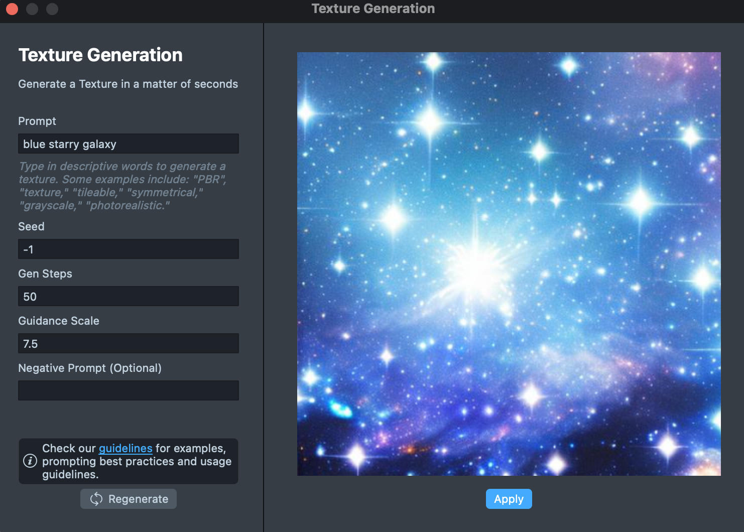 - Enter a prompt in the text box and click Generate. The material will take around 1 minute to generate. Here are some sample prompts: