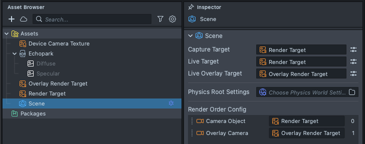 Asset Browserpanel, select theSceneAsset, and in theInspectorpanel, modify the fieldLive Overlay Targetand choose your newly created Render Target.