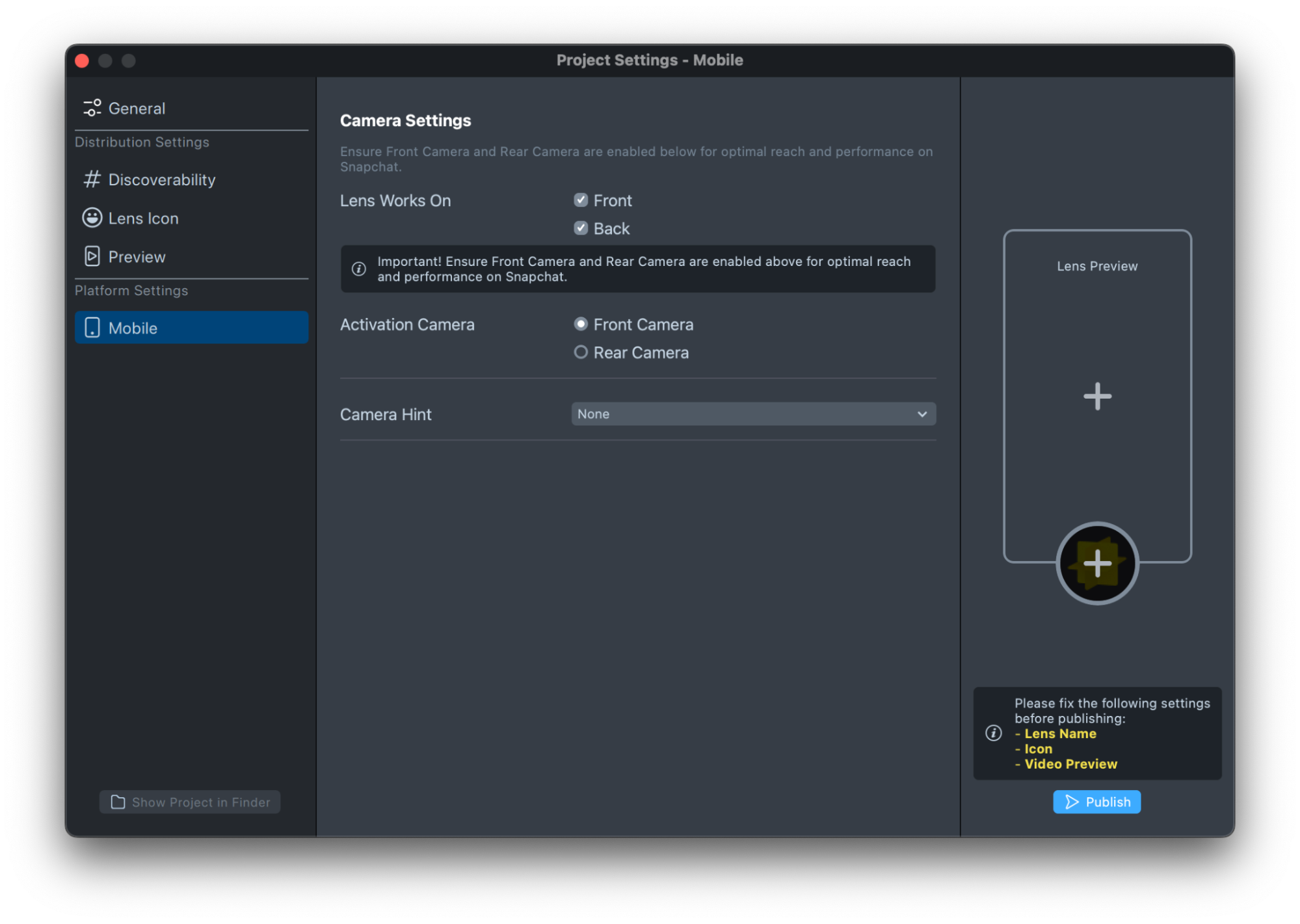 You should make sure the Lens Project Settings is configured properly before submitting the Lens. Below are the various settings that are configurable through the Project Settings settings window.