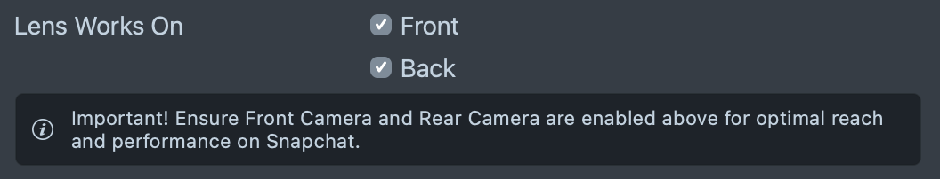 This setting indicates which side of the camera your Lens works on. For example, Face Lenses will automatically be enabled on both sides as long as a face is found. However, a Location AR experience may only be built for the rear camera.