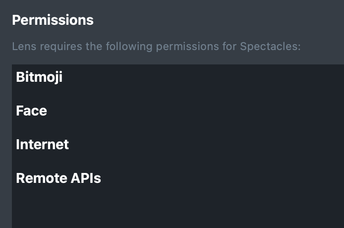 When developing for Spectacles, you may access additional things in the Lens that require the user’s permission to confirm. This page will list out the various permissions your Lens will request when the Lens is used.