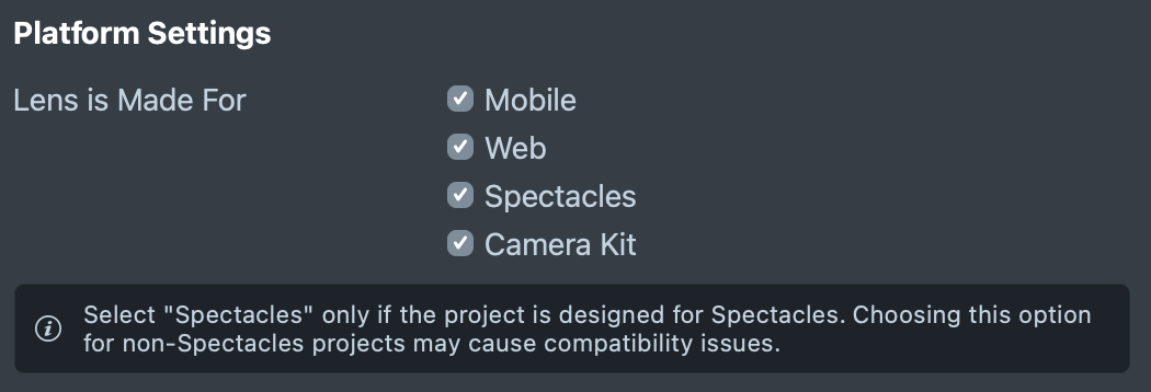 - By selecting Spectacles, your Lens will be enabled for Spectacles. You will only be able to target your Lens for Spectacles if you have either checked your Lens in the Preview panel with the Spectacles device simulation option, OR have paired your device.