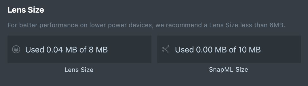 The size of the compressed Lens that will be uploaded upon submission. The size limit for a submitted Lens is 8 mb but we advise staying at 2 mb or less for a quicker download. For more information, refer to the Performance and Optimization guide. For information on optimizing 2D images, see the 2D Optimization guide.