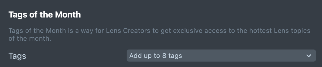 Tags of the Month is a way for Lens Creators to get exclusive access to the hottest Lens topics of the month. Tags are sourced from both on-platform and off-platform repositories to highlight the “hottest” themes/trends of the moment. Creating high quality Lenses related to these tags, and tagging them here will increase your chances of being featured across a number of places in the app!