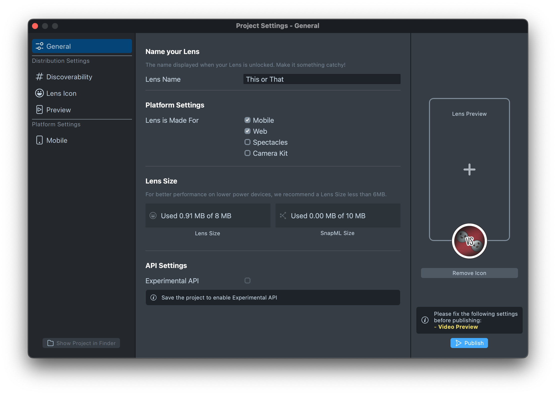 If you click on the Project Settings button in Lens Studio's toolbar, you will see various settings to configure your Lens Project.