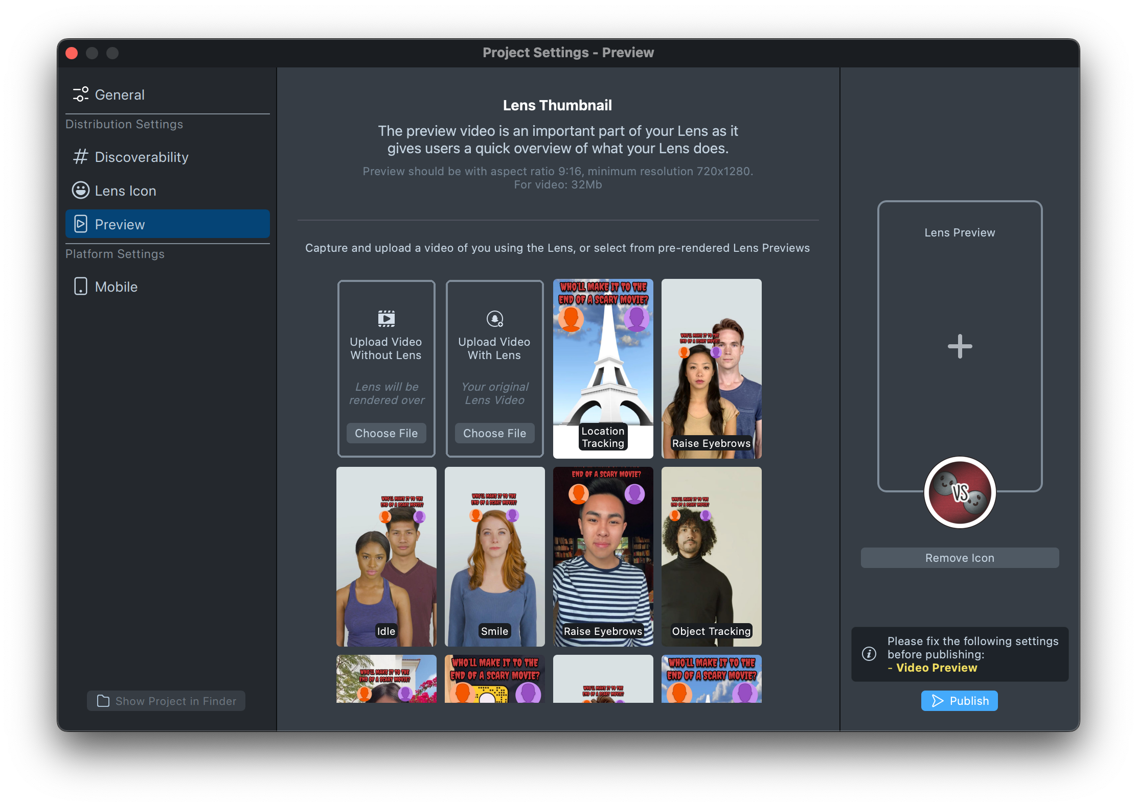 There are two ways to add a Lens preview video, through the Project Info settings or My Lenses submission process.