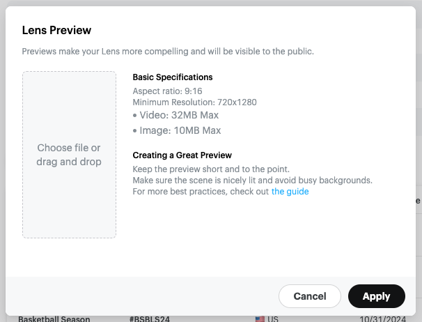 This will take you to the Lens Preview window. Click the Choose file or drag and drop button, or drag your file to the box to add your preview.