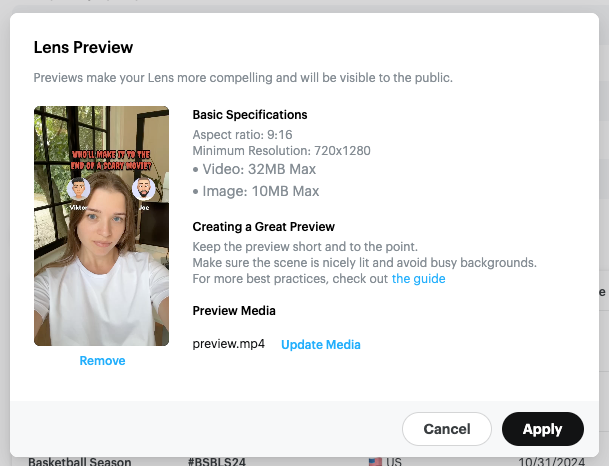 - Sometimes, your preview video will be displayed as a static image. Because of this, make sure the first frame of your video is compelling and shows off the defining elements of the Lens.