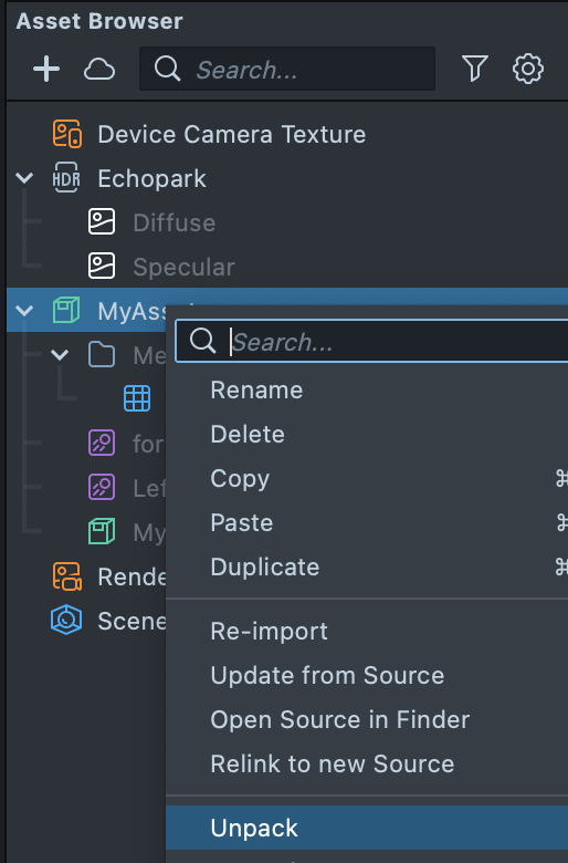 Once you unpack a 3D Assets, you can not update the assets based on the source as easily, as you'll be unpacking the 3D assets to Lens Studio native assets. Though, you can reimport or relink.