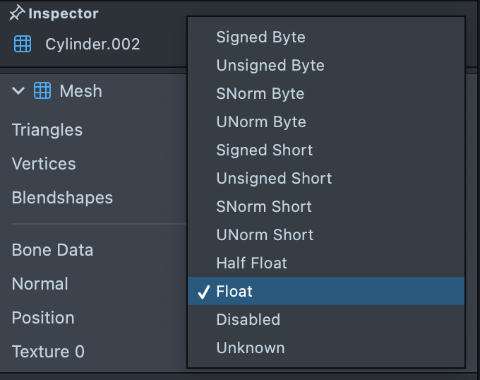 - Position: Float, Half Float, or try to rearrange your model data so that all positions are within a [-1, 1] range, in that case SNorm can be introduced.