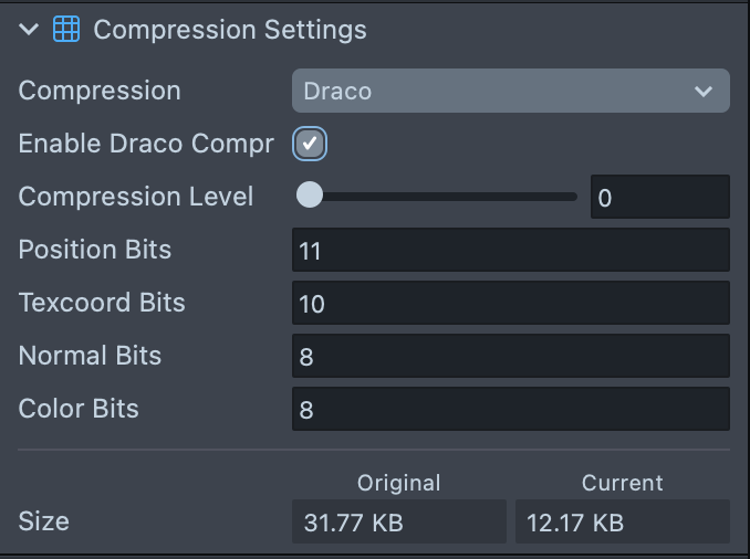 Although decimation/simplification methods could be applied for hi-res meshes, however all automatic methods can’t reduce polycount to actual low poly values while keeping good details. Draco compression comes in handy when working with relatively limited lens sizes, compression could be 10x smaller compared to the original which allows you putting more meshes into a single lens.