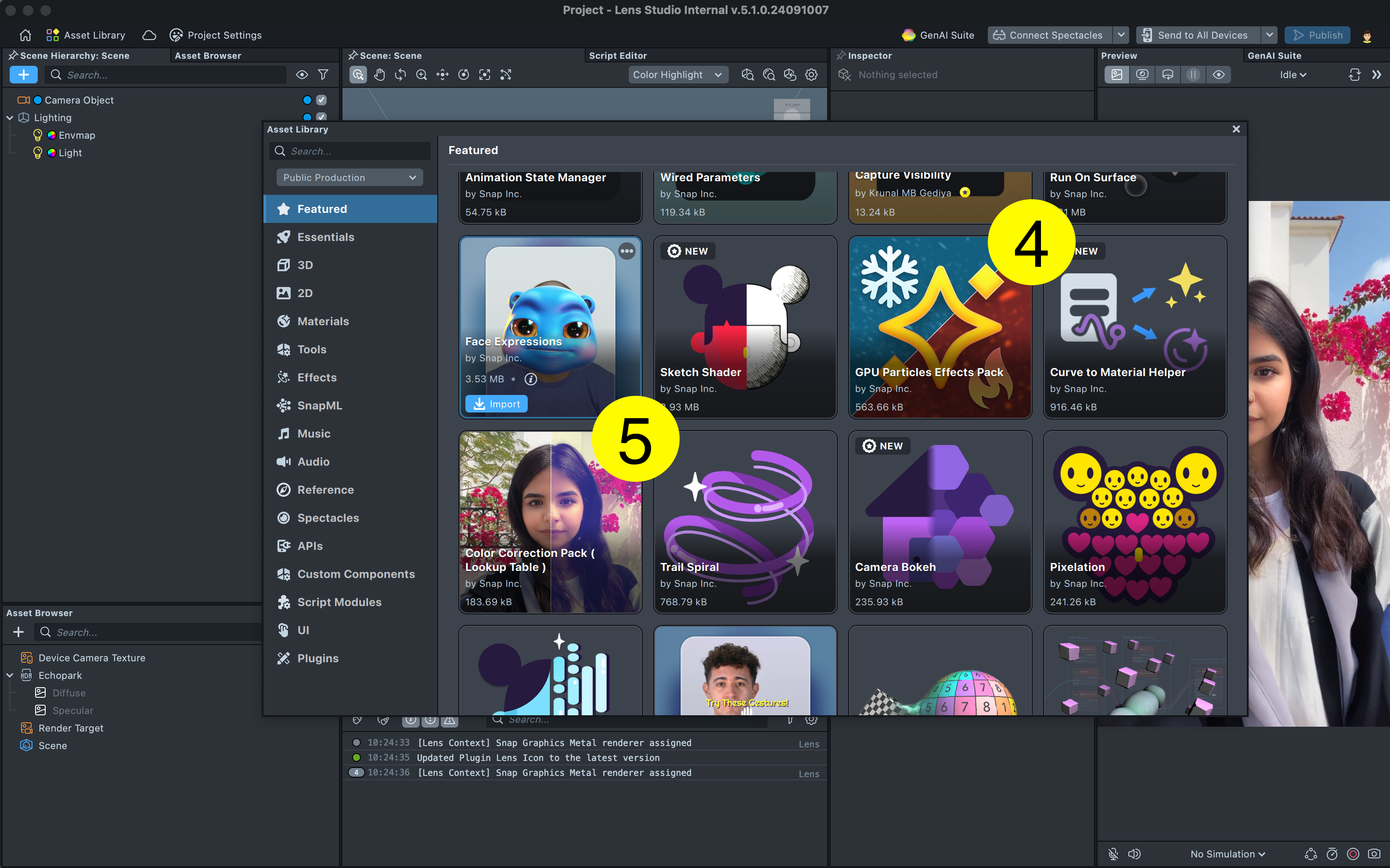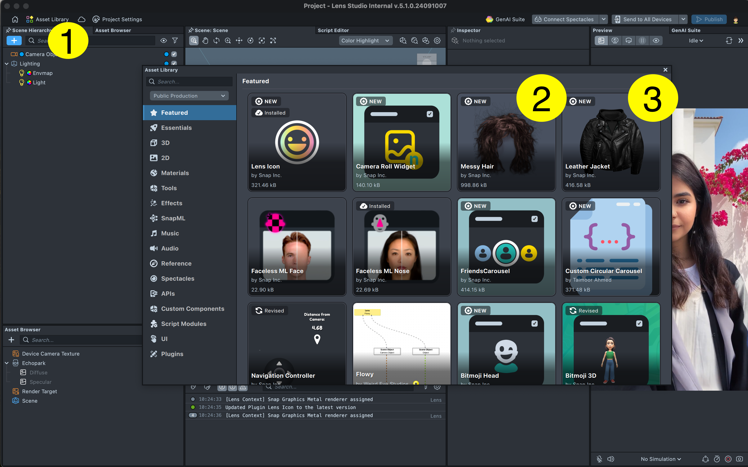 First we construct the Lens. To speed up development, we leverage the Asset Library. We open the Asset Library (1) and add the following assets to the Scene: “Messy Hair” (2), “Leather Jacket” (3), “GPU Particles Effect Pack” (4) and “Color Correction Pack ( Look up Table )” [sic] (5).