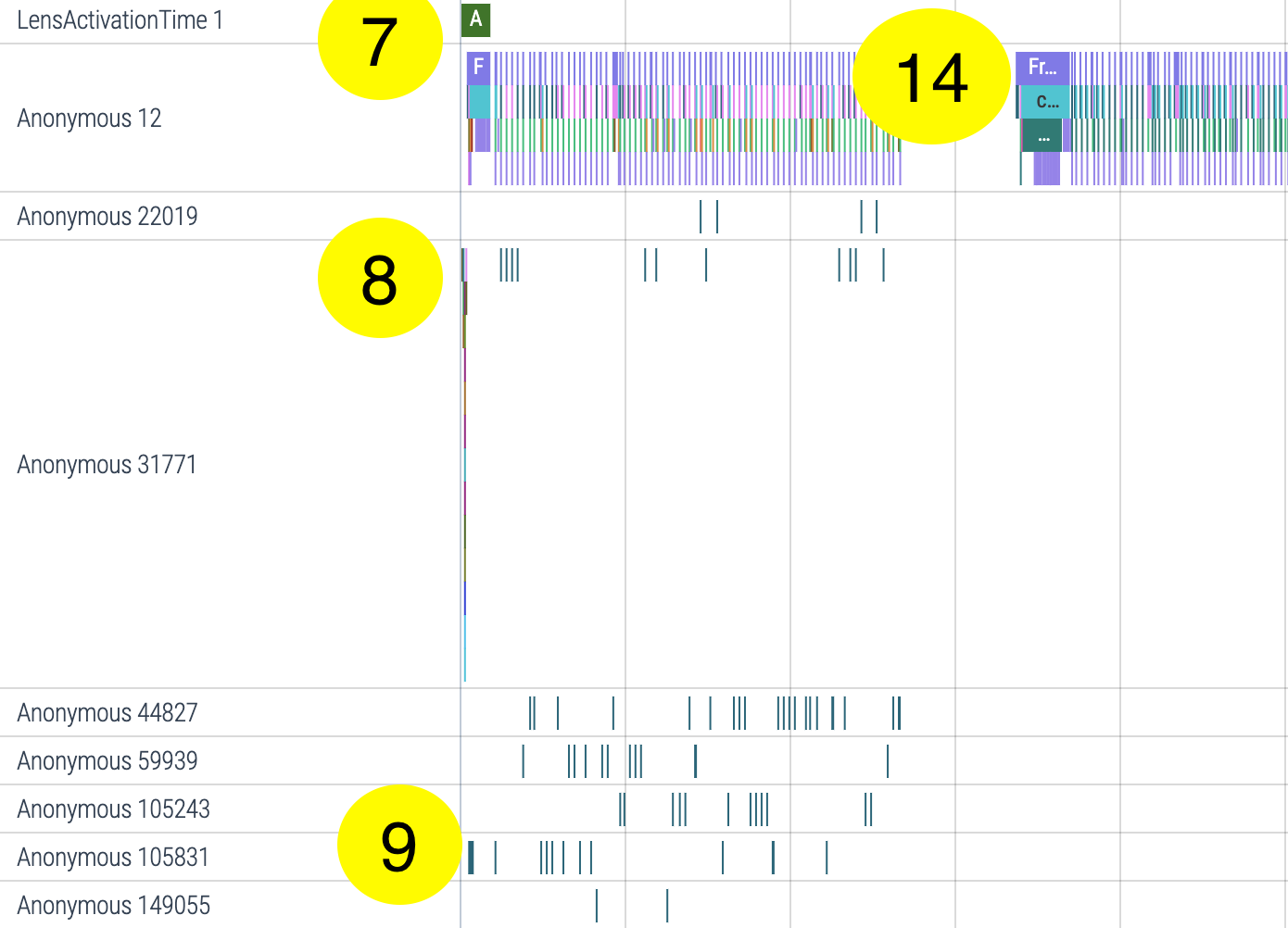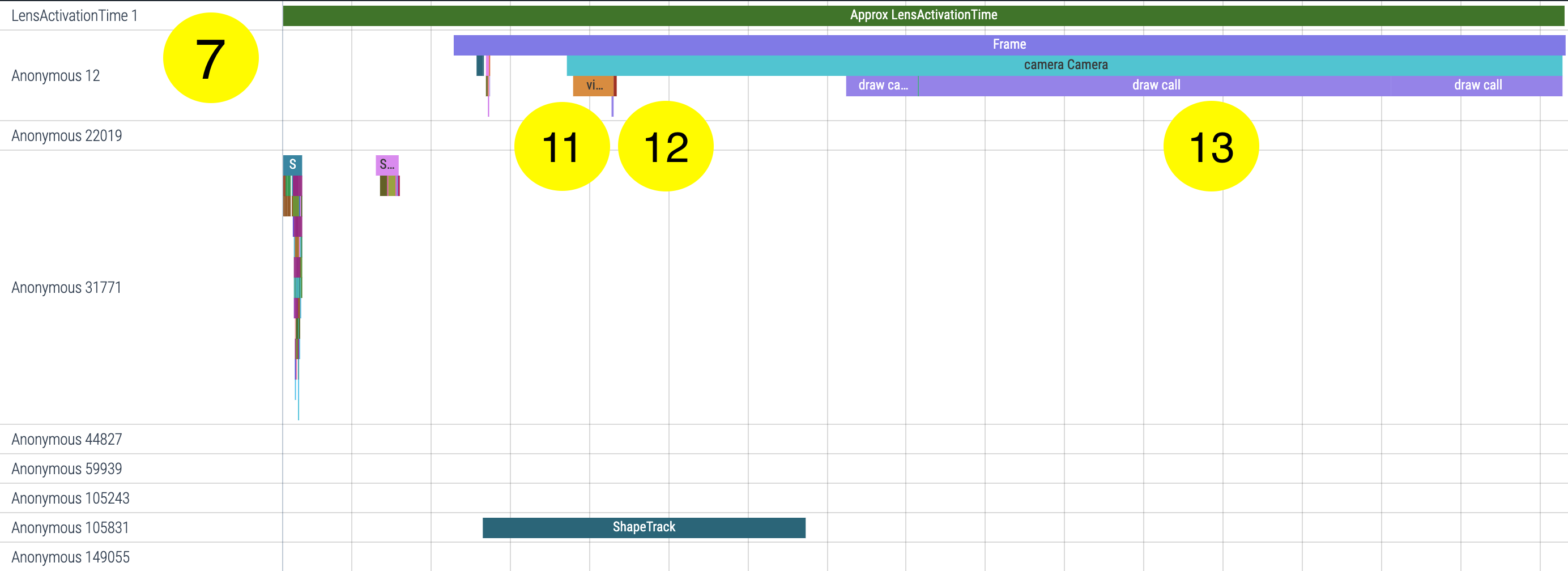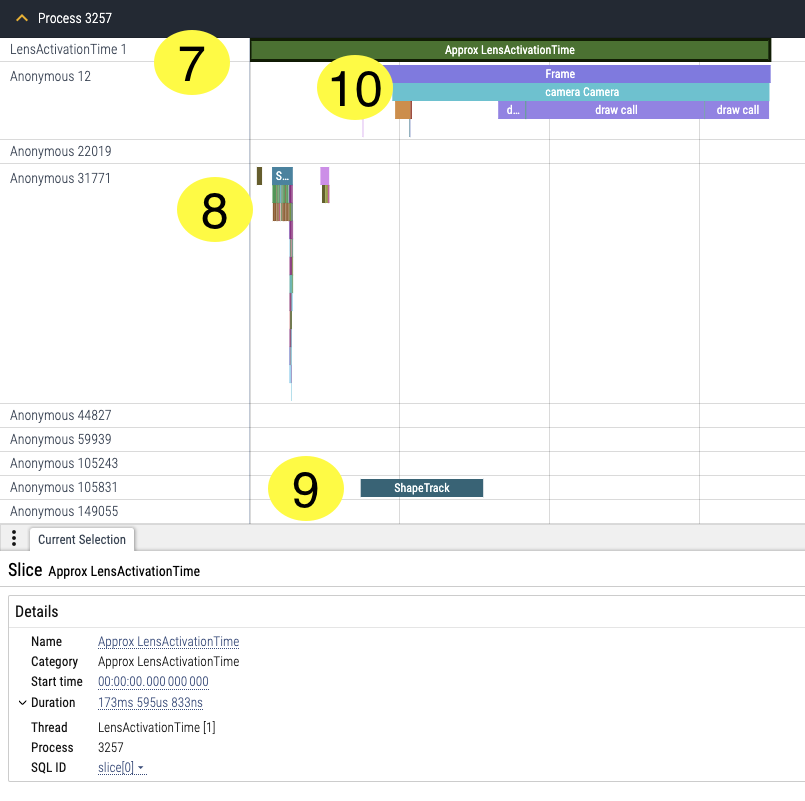 Three seconds in, we switch to the front camera (14). In the picture below are also listed Approx Lens Activation Time (7), Lens Deserialization (8) and first Shape Track (9) for reference.