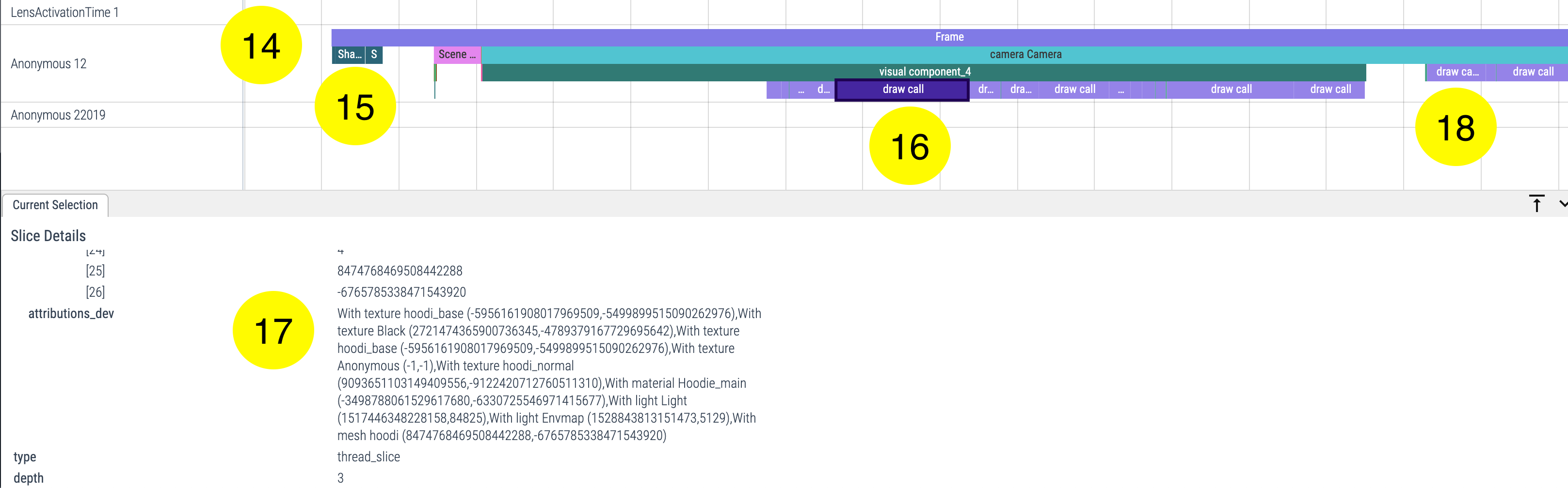 These numbers (X,Y) are engine internal unique identifiers. And we can also find a draw call slice blaming the hair mesh and textures. (18)
