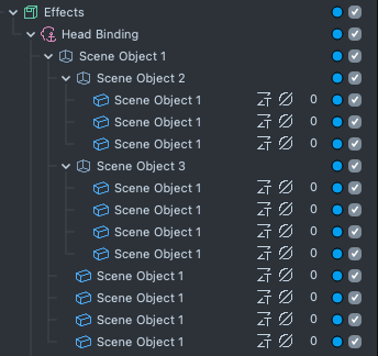 Below, on the right, is an example of what an incorrect Render Order in scene config looks like. The effect attached to the eyes is unstable when the model moves. However in the image on the left with the correct scene config, the effect attached to the eyes stays much more stable when the model moves.