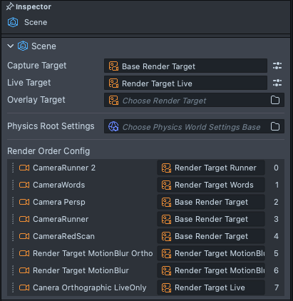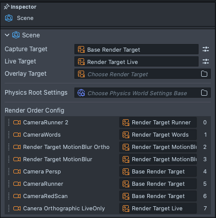 - The wrong order for Render Targets can cause some objects to lag. The Render Target in Scene config must correspond to the logical order of the cameras so that the render targets used in subsequent render targets must be rendered before them. Below, the image on the left shows the wrong render order. The right image shows the correct order. This is because "Render Target Motion Blur" is used as an input in “Render Target Motion Blur Ortho”, which is used in “BaseRenderTarget”.