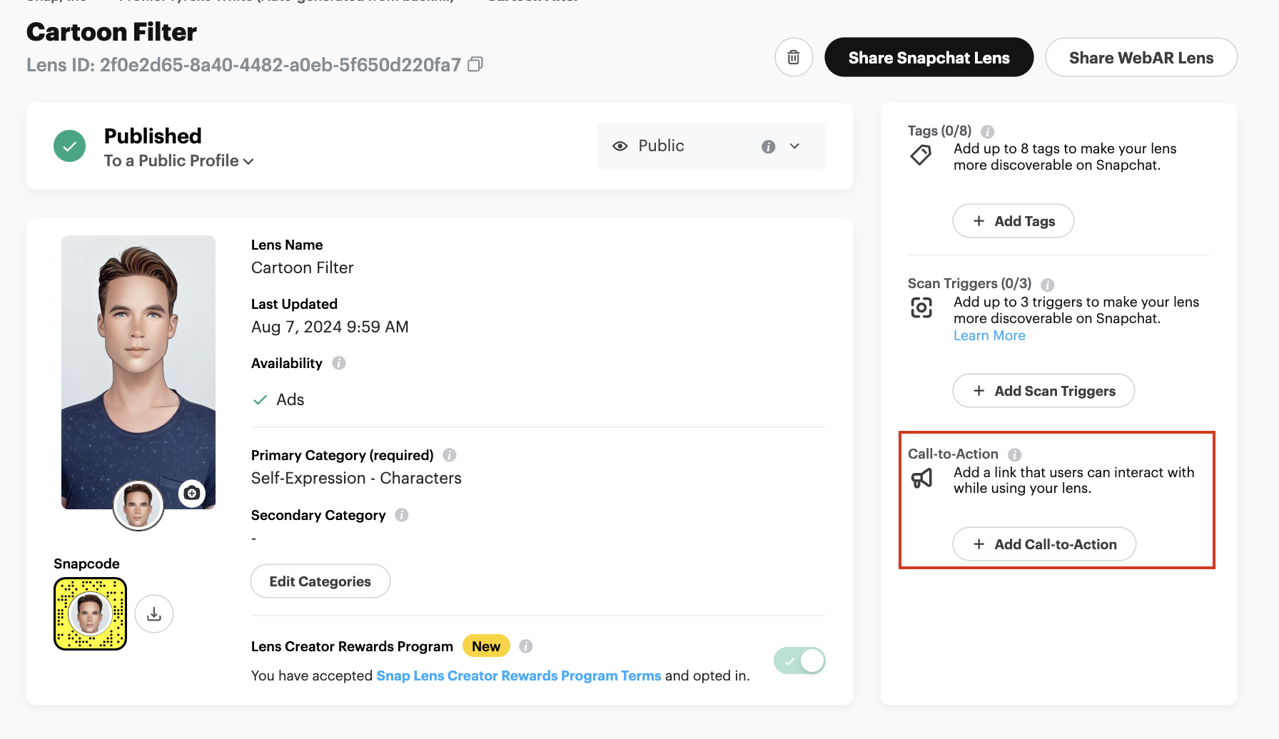 Here you can search for your Lenses, get its status, change its details, as well as get its Snapcodes or Link so you can share it.