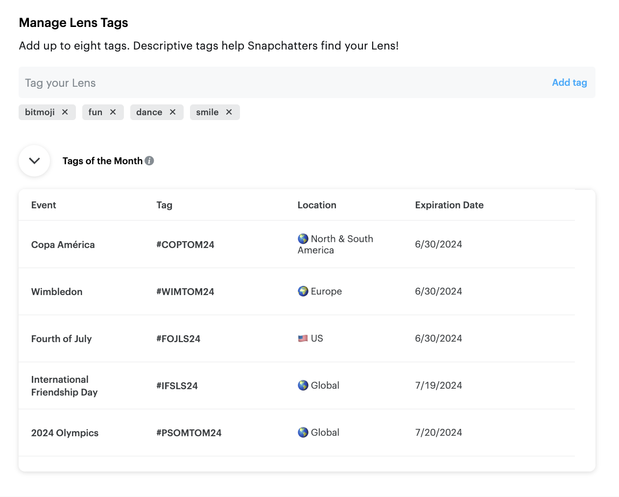 To learn more about adding tags to your lens, see the Snap AR Tags of the Monthsection.