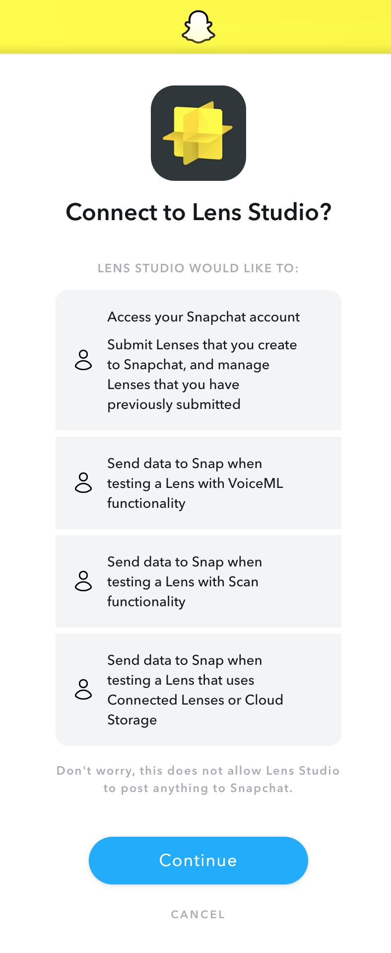 Next, you'll be prompted to authorize Lens Studio. Click Continue.