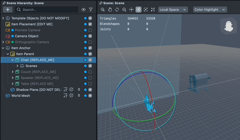 The Item Placement Script object contains the main logic used to place an object on a horizontal surface.