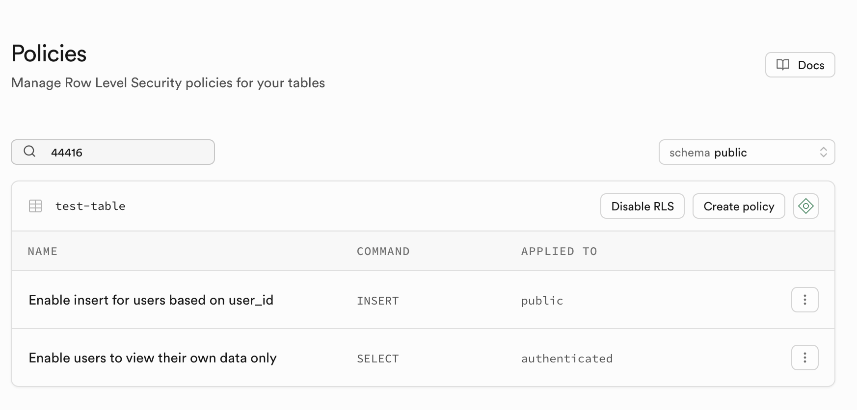 Next, click on the New Table button. Name your table test-table. Note the table by default has Row Level Security (RLS) enabled. This enables you to easily control access to specific table rows. In this case, we will restrict reads and writes by User ID, meaning a user can only read and write to their own rows.