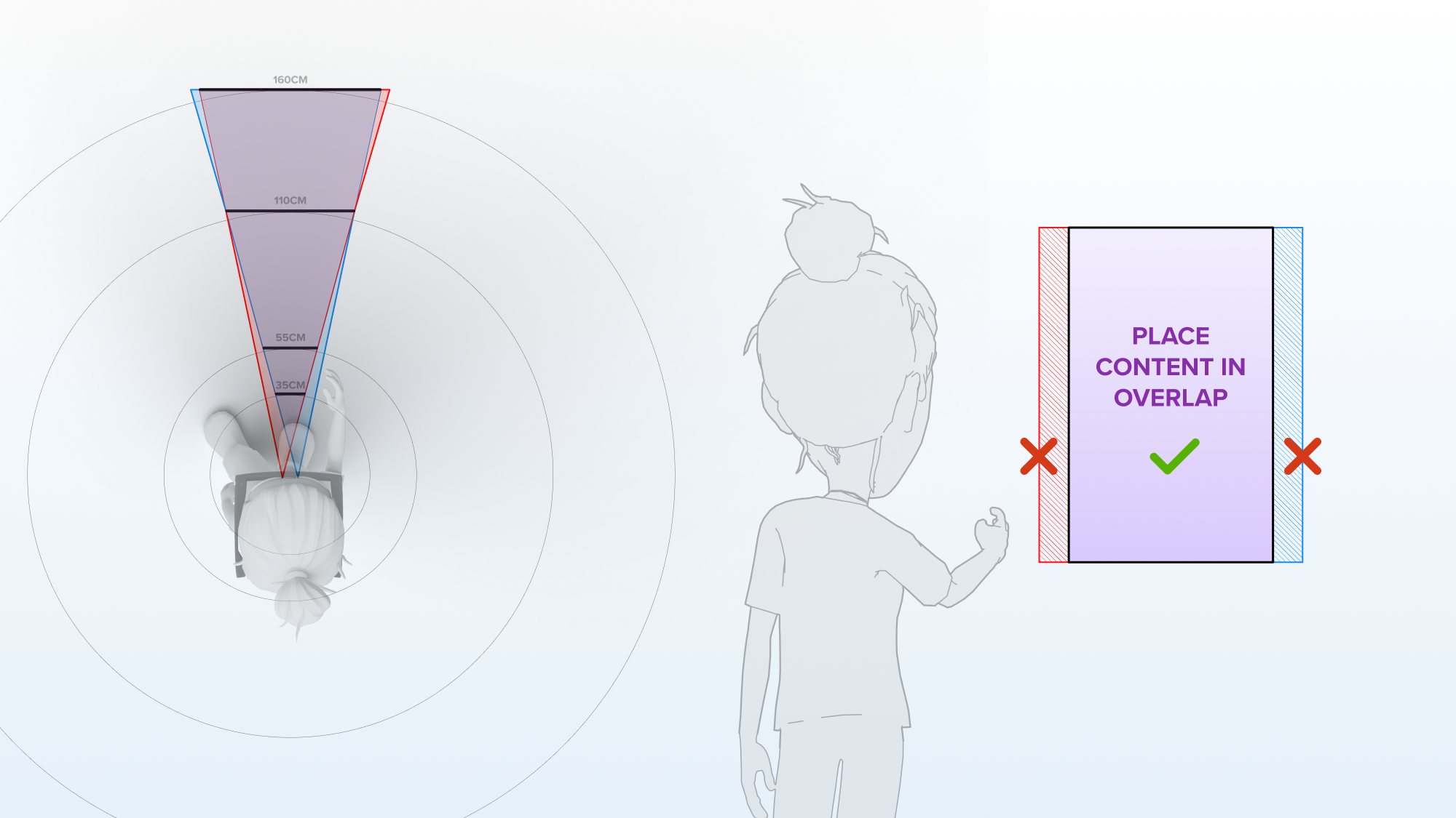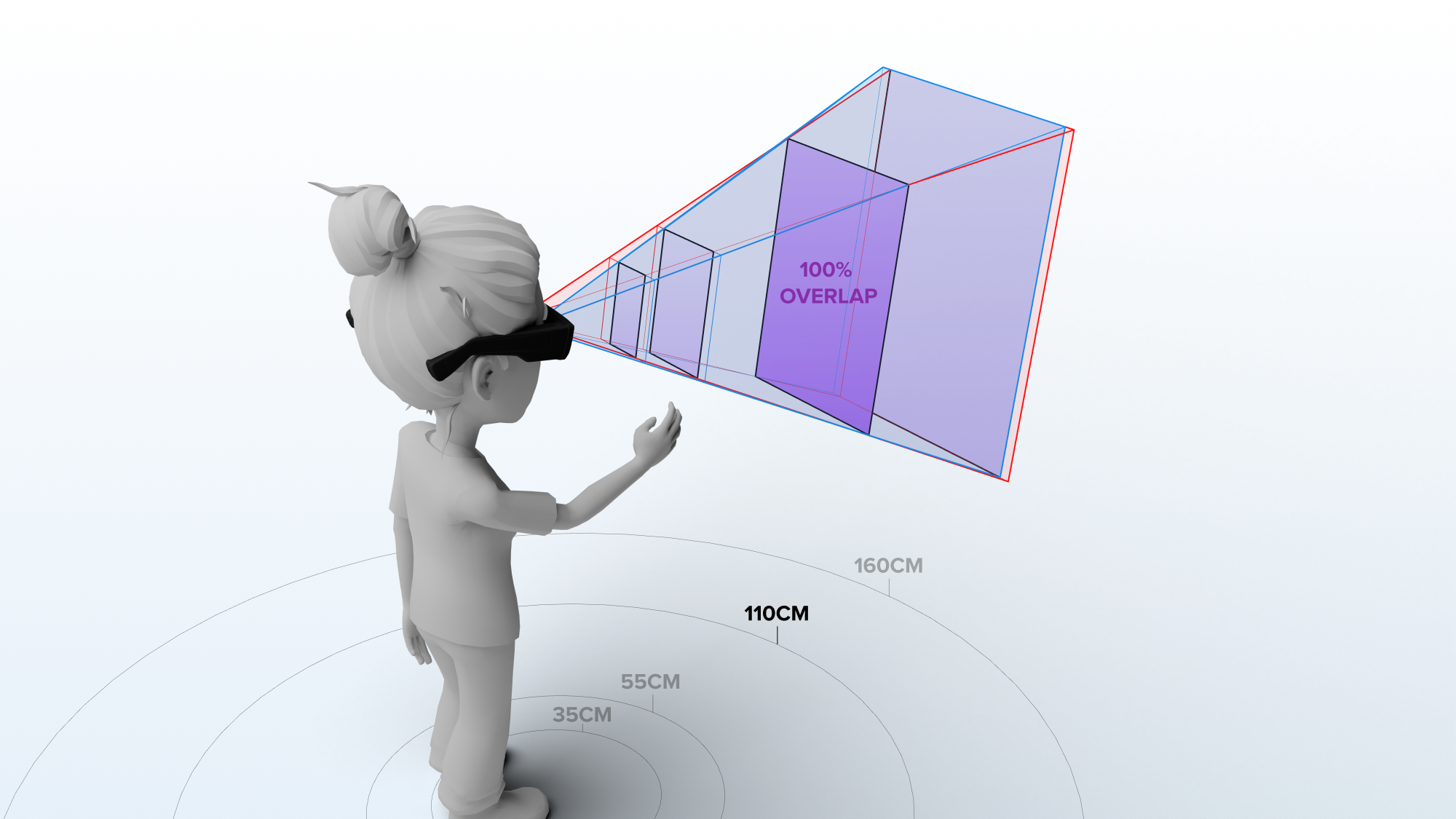 - The displays achieve complete overlap at a distance of 1.1 meters from the user. At this distance, the visible content area is approximately 1000px x 1397px or 53cm x 77cm. For more information, refer to Positioning & Sizing Content.