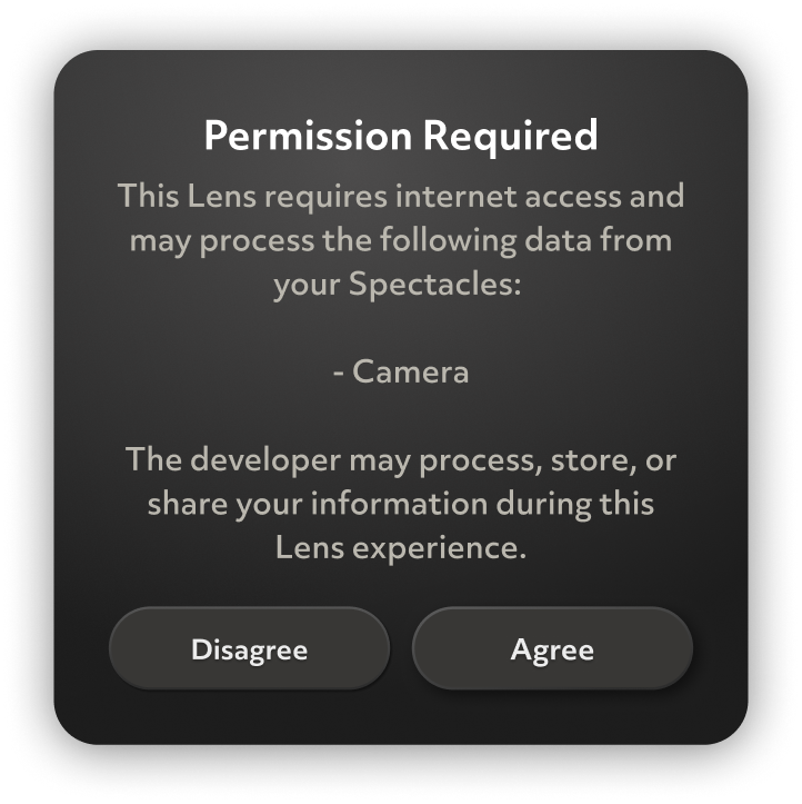 Spectacles prioritizes user privacy by default. Previously, Lenses could not combine external connectivity (internet or Bluetooth) with sensitive data access. Transparent Permission enables this combination by ensuring users explicit awareness.