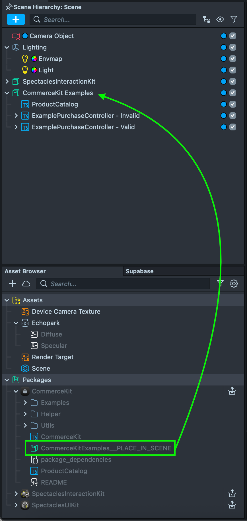 Navigate to Packages → CommerceKitExamples__PLACE_IN_SCENE.prefab