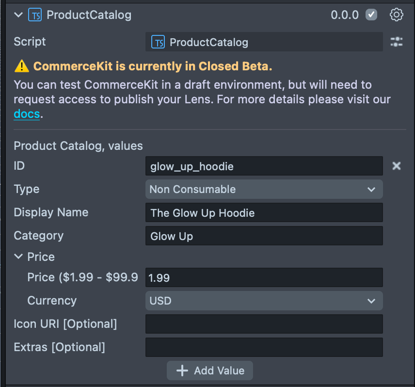The ProductCatalog SceneObject in the example prefab is where you define what users can purchase. Each product you create will appear in your Lens's shopping interface.
