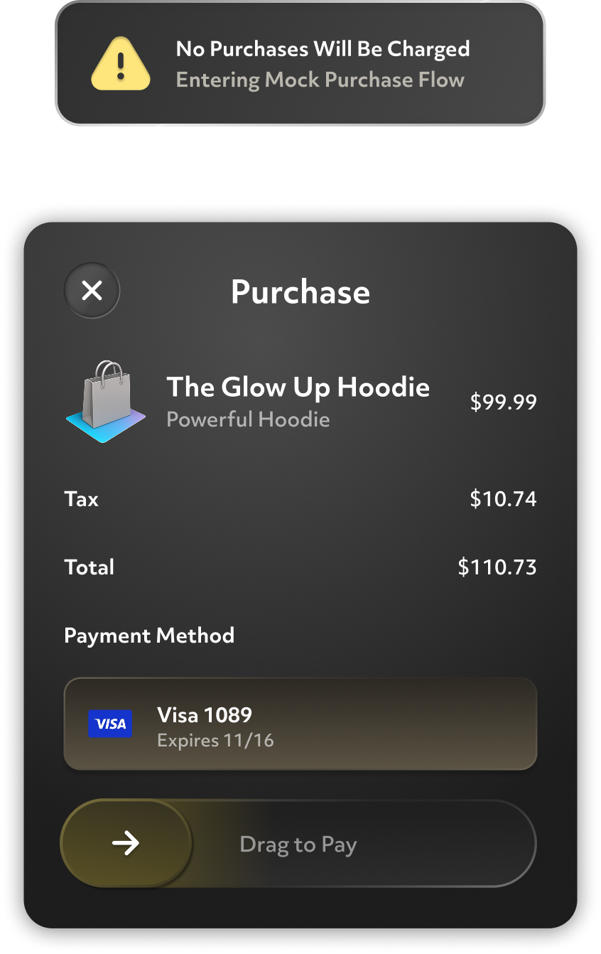 Commerce Kit provides mock purchase flows in both development environments, allowing you to test your implementation without real transactions.