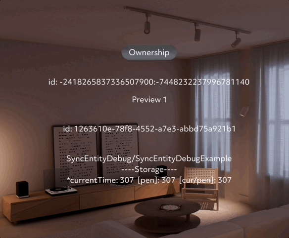 SyncEntityDebug is a helper script that can show SyncEntity information using text components. It is especially useful for debugging SyncEntities on device. SyncEntity information that can be shown by the SyncEntityDebug script includes: