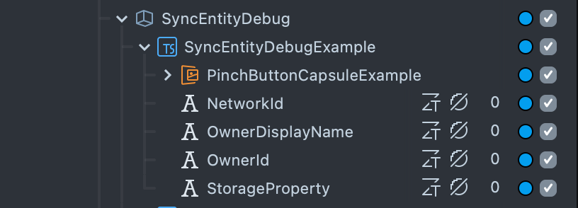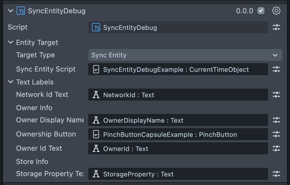 - Add the SyncEntityDebug script to a scene object in the Scene Hierarchy. Populate the relevant text component inputs in the SyncEntityDebug script Inspector panel. You do not have to populate all inputs.