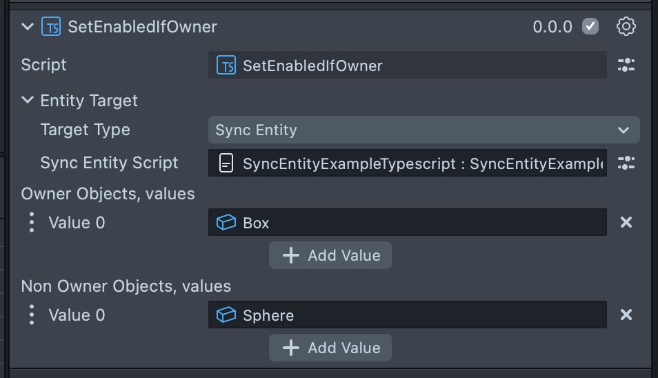 Entity Target can either be a Network Root, for use inside of prefabs link, or a SyncEntity. If Network Root is selected, this script will automatically find its network root upon instantiation.