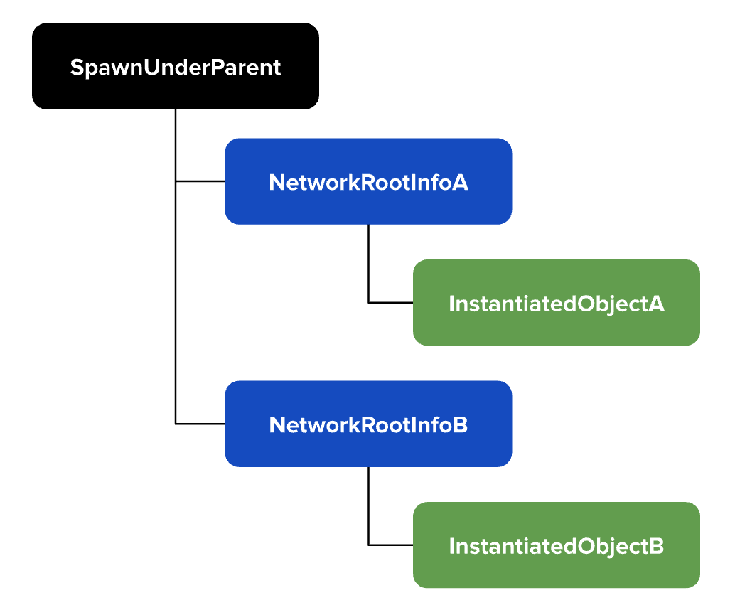 When a prefab is instantiated by the Instantiator, it is created as a child of a root scene object that holds the NetworkRootInfo. The NetworkRootInfo scene object is spawned as a child of the Spawn Under Parent set in the Instantiator Inspector inputs. This was done to solve a few problems, including enabling SyncEntities to find their NetworkRootInfo, and ensuring initial transforms are correct.