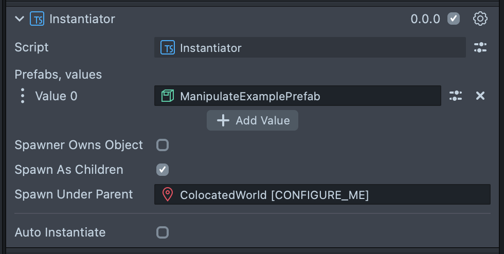 - Spawn as Children: If enabled, a Spawn Under Parent input will be visible. Populate this input with the scene object that will be the parent of instantiated objects. If left blank, objects will be spawned under the Instantiator scene object.