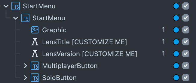 You are highly encouraged to customize the Start Menu to match the design of your Lens. To change the Start Menu visuals, locate the StartMenu scene object in the Scene Hierarchy.