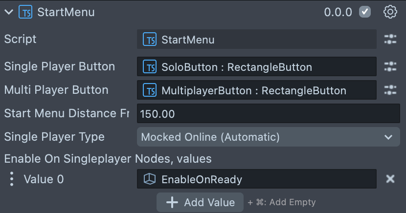 The Inspector panel for the StartMenu script includes two inputs for configuring single player mode – Single Player Type and Enable On Singleplayer Nodes.