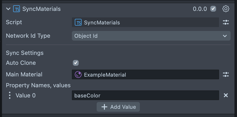 + Add Valueand enter the string of the property name to be synced, e.g.,baseColor.
