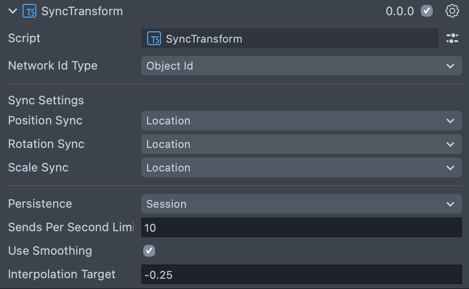 To begin setup, add the SyncTransform component to the scene object to be synced. Next, configure the following inputs in the Inspector panel: