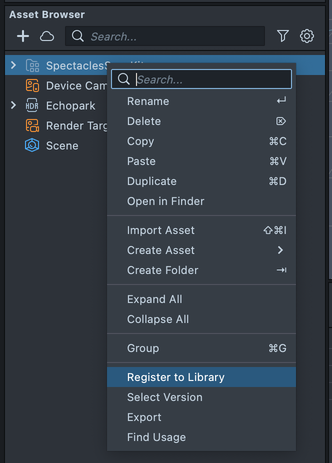 In the Asset Browser, right click on the Spectacles Sync Kit package and select Register to Library. Registering the package to your library ensures that future updates can be detected. If you already have the package registered to your library, this option will not be available.