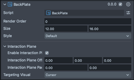 Targeting Visual | A dropdown selection for which targeting visual the interaction plane uses when it is activated. Options are None, Cursor, Ray. |