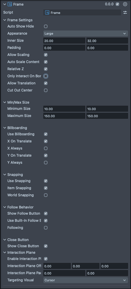 Appearance | A dropdown selector for the appearance of the Frame's UI offering. The options are Large and Small. Each sets the width of the border and changes the size of the builtin buttons. Large is appropriate for far-field interactions, while Small is more suited to near-field. |