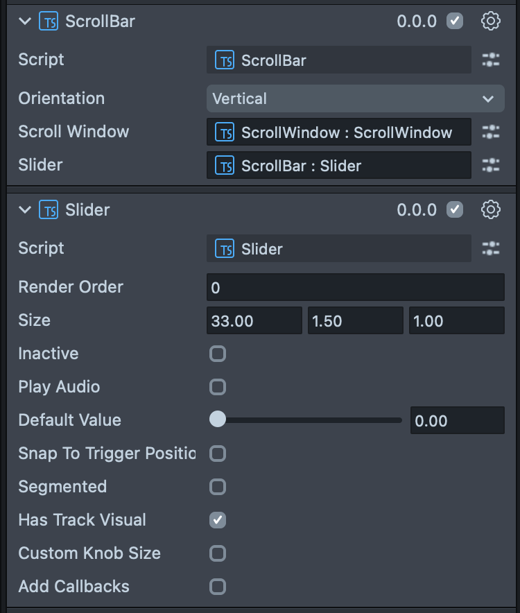 This component is a helper component for ScrollWindow. It requires both a ScrollWindow and a Slider. A useful setup is having a "Scroll Parent" object with two objects as children: an object with a ScrollWindow and an object with the ScrollBar and a Slider.